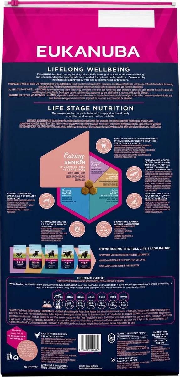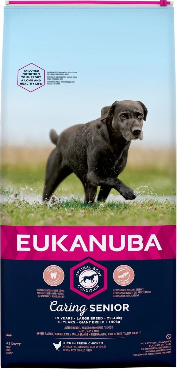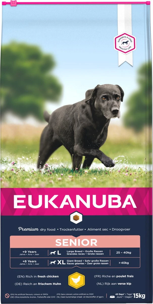 100% complete en uitgebalanceerde voeding. Deze Eukanuba voeding is samengesteld om te voorzien in de speciale voedingsbehoeften van deze oudere honden van grote rassen, ter ondersteuning van een gezond gebit, gezonde gewrichten, gewichtsregulering en een goede spijsvertering. Verschaft de optimale dagelijkse hoeveelheid eiwitten, vetten, koolhydraten, belangrijke vitaminen en mineralen die bijdragen aan een goede gezondheid van je hond. Bevat ingrediรซnten van hoge kwaliteit en een hoog gehalte aan eiwitten van dierlijke oorsprong.