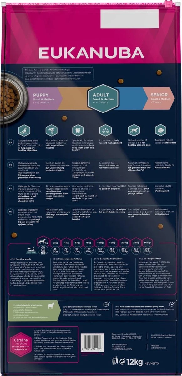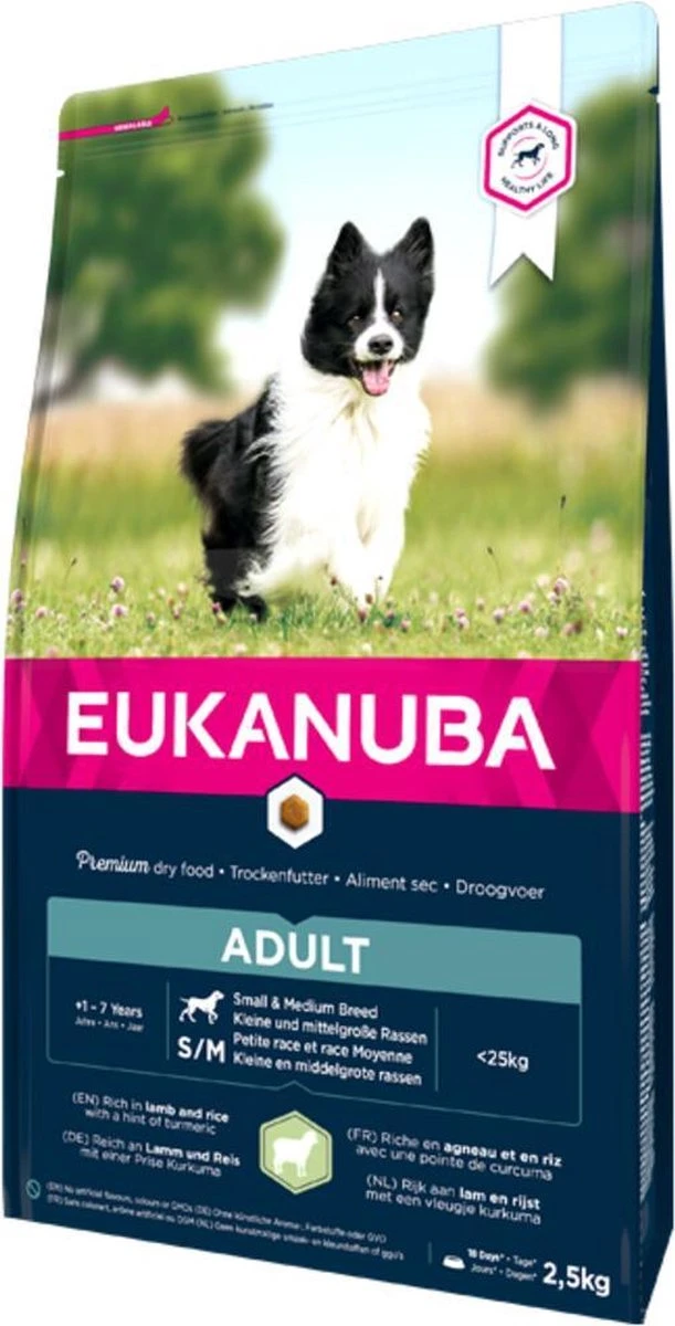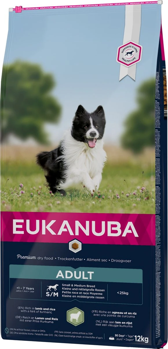 Eukanuba Dog Adult Small & Medium Breed is een 100% complete en uitgebalanceerde voeding, zelfs geschikt voor gevoelige honden. Eukanuba verschaft de optimale dagelijkse hoeveelheid eiwitten, vetten, koolhydraten, belangrijke vitaminen en mineralen die bijdragen tot een goede gezondheid van je hond.