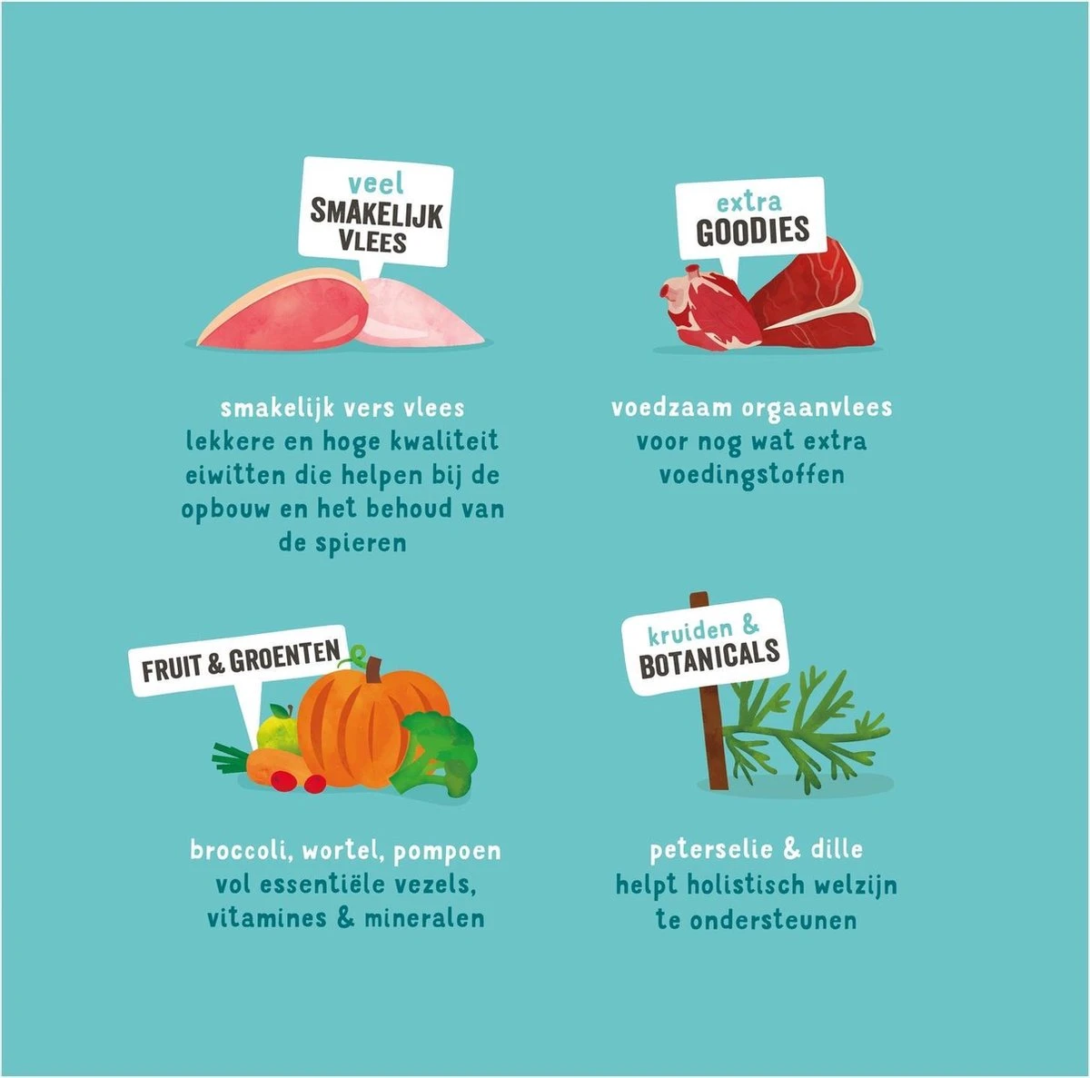 Samenstelling: lam 30%, rund 26%, mineralen, wortels 2%, broccoli 1%, rode bieten 1%, appels 1%, spinazie 1%, peterselie 0,1%, dille 0,1%.