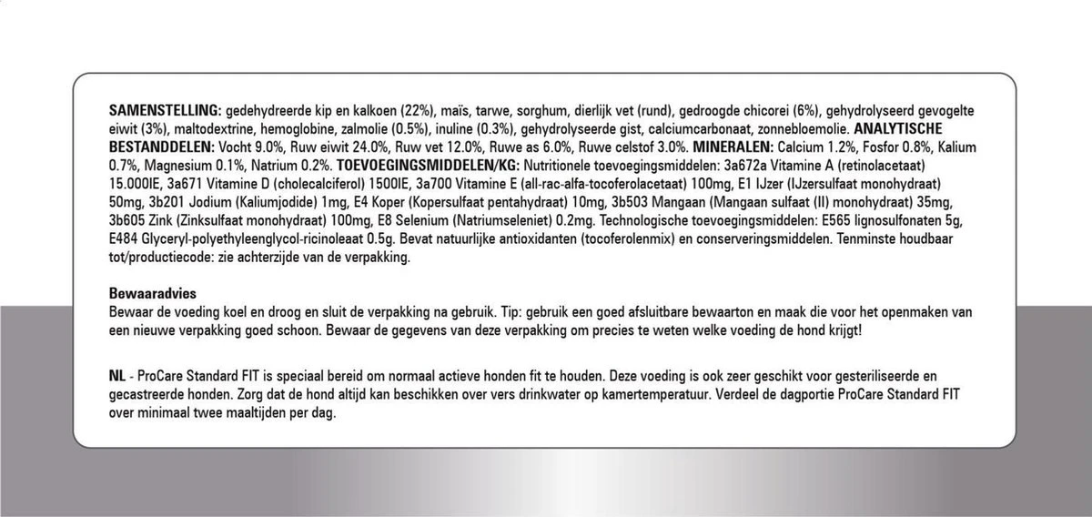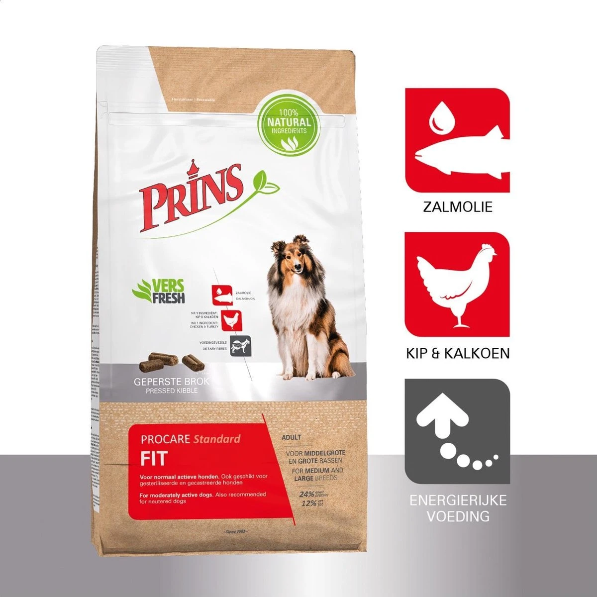 ProCare Standaard-Fit is een ideale voeding voor de volwassen hond met een gemiddeld energieverbruik. Dankzij een aangepast energiegehalte helpt deze voeding de hond in optimale conditie te blijven. Hoogwaardige ingrediรซnten als zalmolie en FOS (fructo-oligo-sacchariden) zorgen voor een gezonde voeding die bijdraagt aan een gezonde huid en vacht, een optimale vertering en een evenwichtige darmflora.
