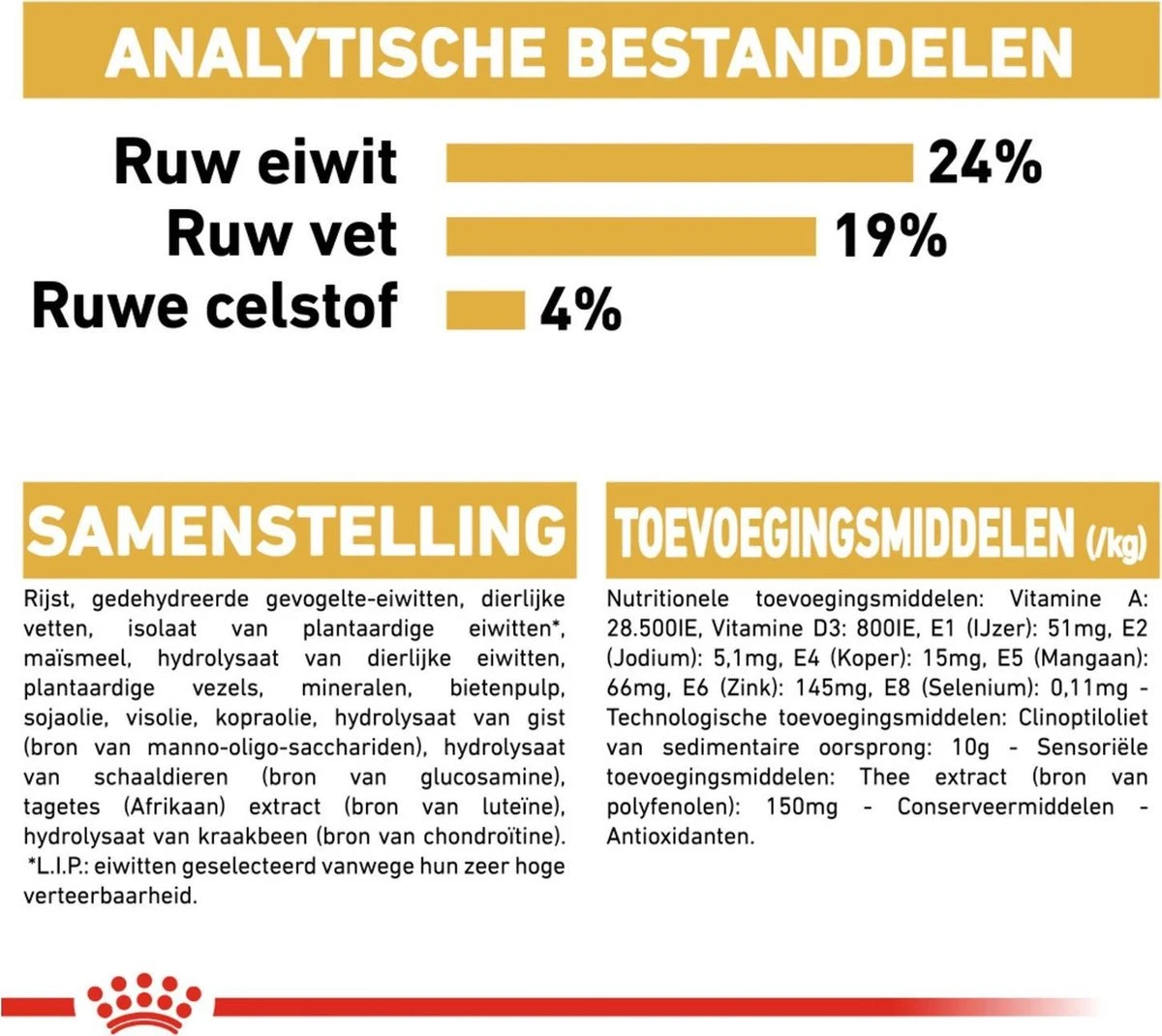 | Voedingswaarde | Samensteling: rijst, gedehydreerde gevogelte-eiwitten, dierlijke vetten, isolaat van plantaardige eiwitten*, maïsmeel, plantaardige vezels, hydrolysaat van dierlijke eiwitten, mineralen, bietenpulp, sojaolie, visolie, kopraolie, gehydrolyseerde gist (bron van Manno-Oligo-Sacchariden), hydrolysaat van schaaldieren (bron van glucosamine), extracten uit groene thee en druiven (bron van polyfenolen), tagetes (Afrikaan) extract (bron van luteïne), hydrolysaat van kraakbeen (bron van chondroïtine) |