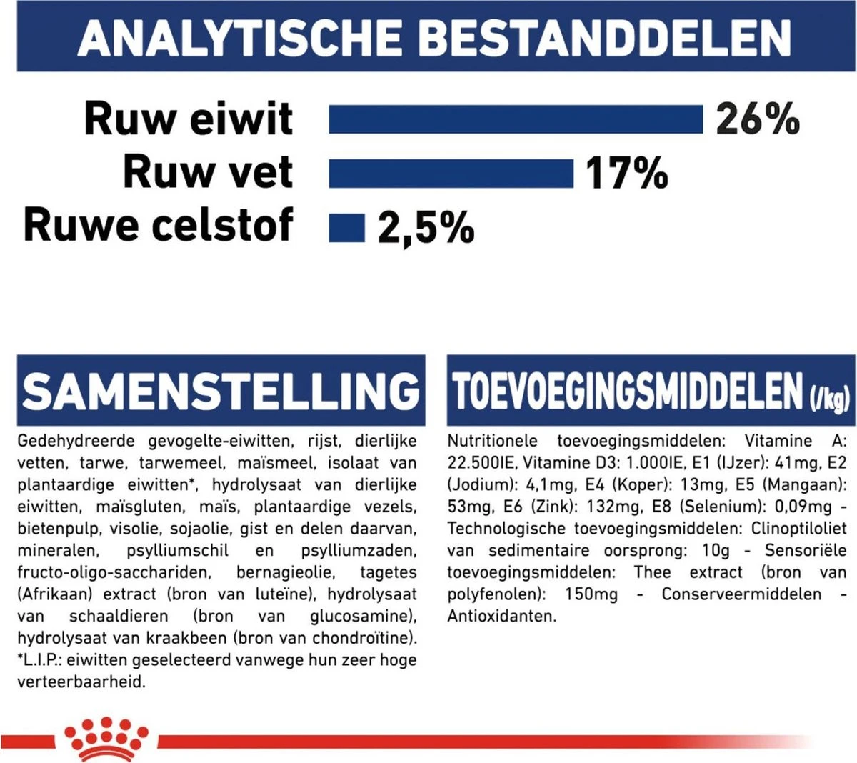 | Voedingswaarde | Samensteling: gedehydreerde gevogelte-eiwitten, rijst, dierlijke vetten, tarwe, maรฏsmeel, tarwemeel, isolaat van plantaardige eiwitten*, hydrolysaat van dierlijke eiwitten, maรฏsgluten, maรฏs, plantaardige vezels, mineralen, bietenpulp, visolie, gist, sojaolie, psylliumschil en psylliumzaden, Fructo-Oligo-Sacchariden, bernagieolie, tagetes (Afrikaan) extract (bron van luteรฏne), extracten uit groene thee en druiven (bron van polyfenolen), hydrolysaat van schaaldieren (bron van glucosamine), hydrolysaat van kraakbeen (bron van chondroรฏtine) |