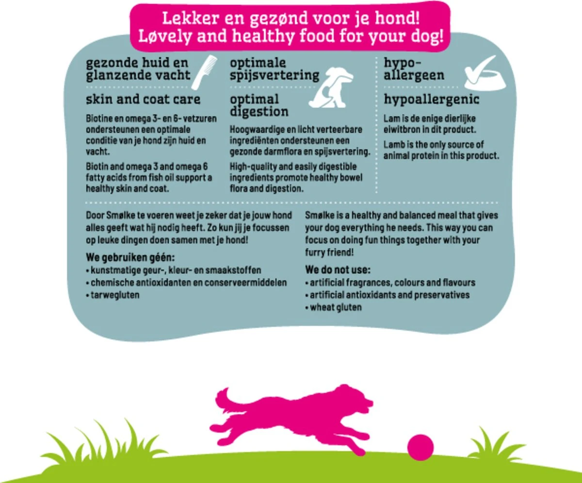 SamenstellingLamsmeel (29%), rijst, aardappelzetmeel, kippenvet (gestabiliseerd met natuurlijke tocoferolen), bietenpulp, vitaminen en mineralen mix, cellulose (1,3%), gist (1,3%), MSC-gecertificeerde visolie (0,8%)*, cichorei (0,7%), natriumhexametafosfaat. *Uit een MSC gecertificeerde duurzame visserij.